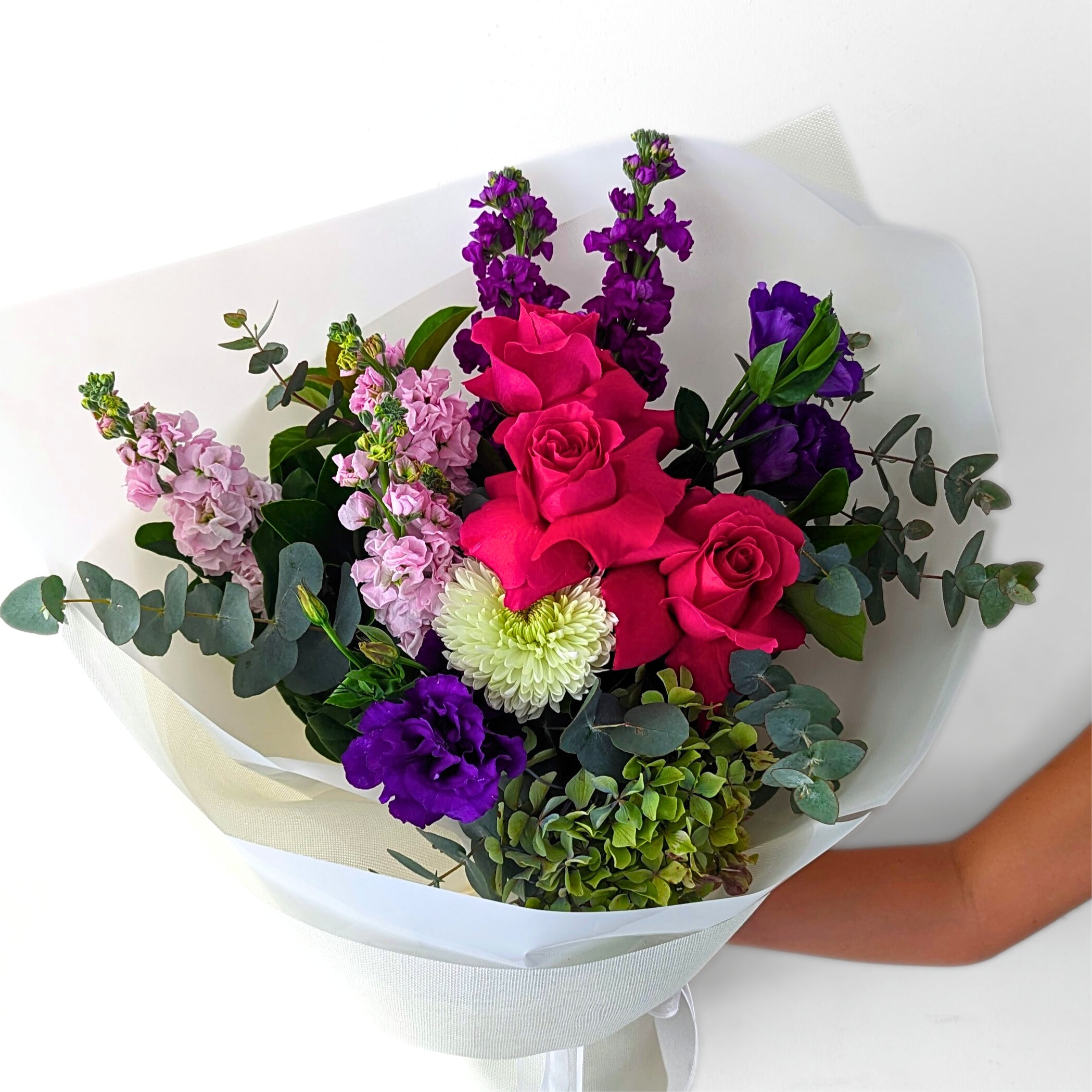 Treat someone to the beauty and fragrance of our exquisite seasonal flower bouquets. Featuring a stunning combination of pink seasonal florals, this arrangement is available in medium and large sizes to suit any preference.